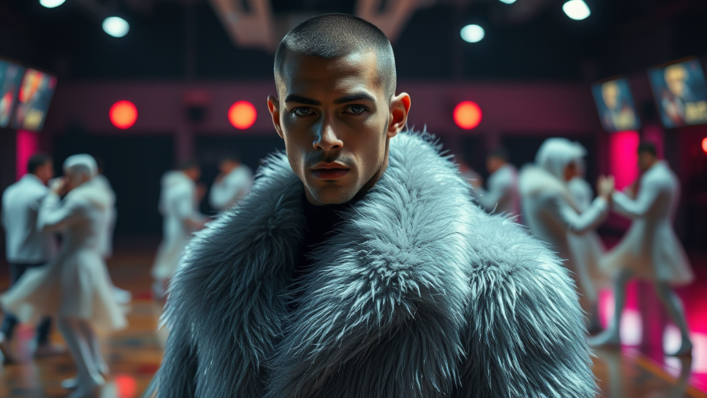 A dark, moody fashion editorial features a striking figure in a sleek, high-fashion spread. Central to the scene is a man with an angular jawline and short, precision-cut hair, posing in a resplendent, iridescent fur coat with a silvery sheen, rendered in an otherworldly material with the texture of chinaware. His piercing eyes seem to command the space as he stands confidently, shoulders squared, amidst a blurred dance floor whirring with cowry glimmering white figures lasered out of focus, gym floor electrified by ultraviolet lights contrasting starkly against minced, ivory tubas that look cherubic in the glow of lights emitting fierce pixels half-fracturing neon ruby lights, brandished trios raccoons fooled glazes snapping house regulation.
