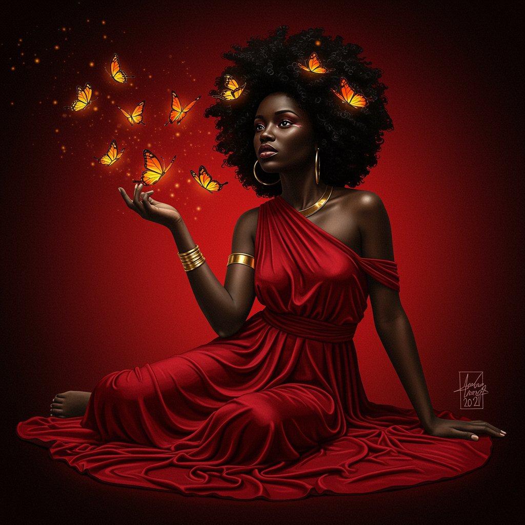 A dark-skinned female goddess of love, adorned in a flowing red dress, sits gracefully on the ground, her regal presence commanding the attention of vibrant butterflies that flutter around her like jewels in the air. She radiates the enchanting allure of an African princess, her features a harmonious blend of strength and elegance reflective of Thomas Blackshear and Rossdraws' vision. Her eyes, deep and knowing, reflect an afrofuturistic essence, with hints of Rob Rey’s art style adding a modern twist. Her hair cascades like a crown, capturing both the traditional and the avant-garde. Inspired by the beauty of Lily Delissa Joseph's work, she embodies the ethereal aura of a butterfly goddess, blessed with the fiery spirit and creative prowess reminiscent of Eddie Mendoza's imaginative flair—a stunning embodiment of black art and an African queen's timeless grace.
