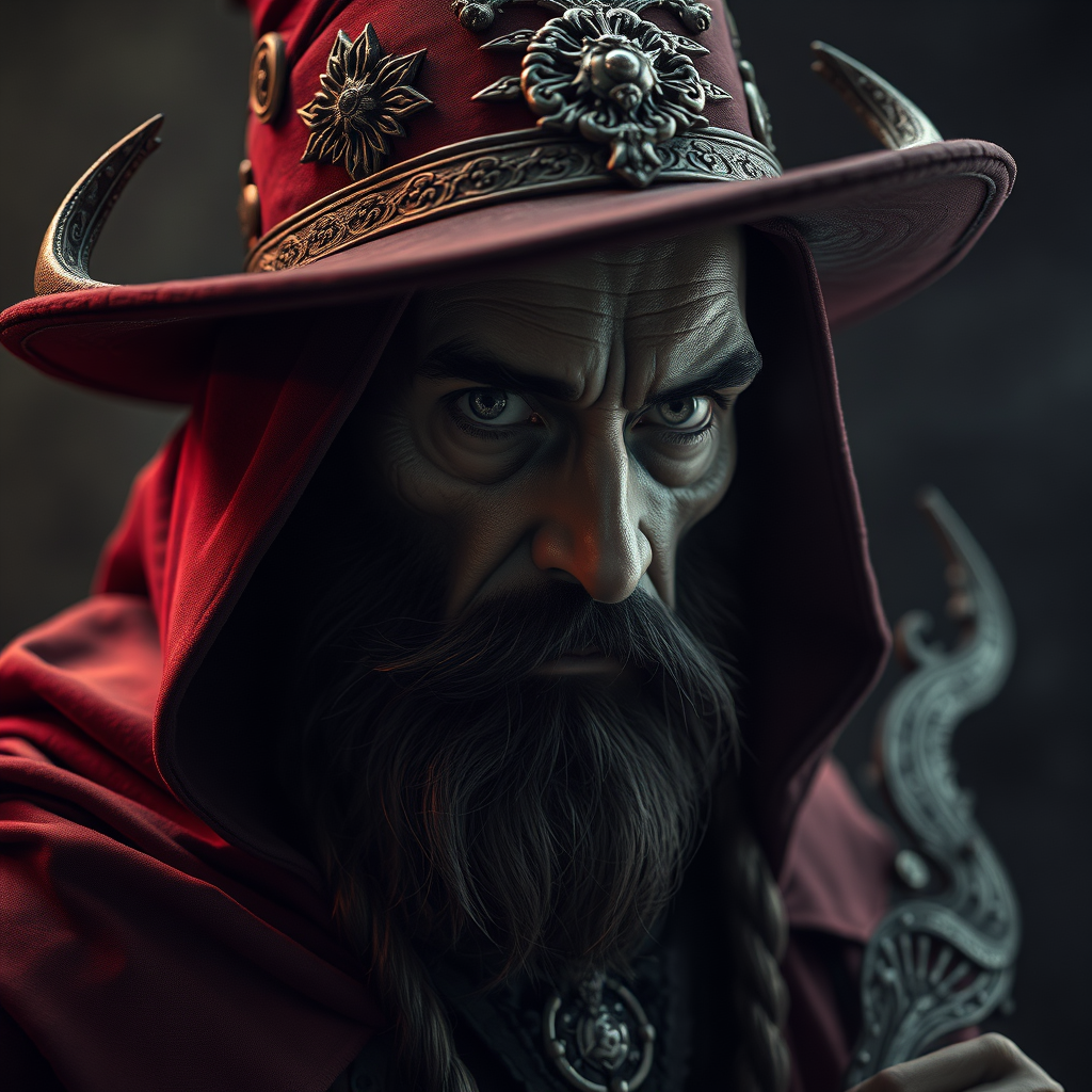 A dark sorcerer::, detailed portrait, elaborate, decorative, dynamic lighting, cinematic atmosphere, balanced composition, strong contrasts, matte texture.