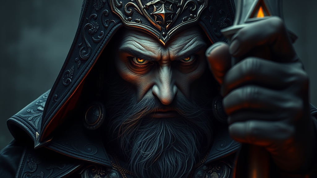 a dark sorcerer, detailed portrait, intricate and ornate design, dramatic volumetric lighting, cinematic atmosphere, carefully balanced composition, high contrast elements, matte painting style.