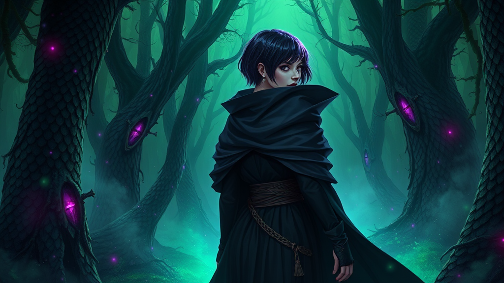 A dark sorceress in an adventurous ensemble, enveloped in a voluminous cloak, wanders through an enchanted forest filled with dragon-scale textures and mystical energies. Her hair is a sleek, short purple-black fade, capturing the dim glow of night. The scene is bathed in ethereal green neon mist, casting an otherworldly light. The setting is intricate and elegant, with a clear focus on the detailed illustration. Created with inspiration from digital painting and concept art masters like VLOP, Artgerm, Greg Rutkowski, and Alphonse Mucha, this masterpiece carries a mystic elegance and refined artistry.