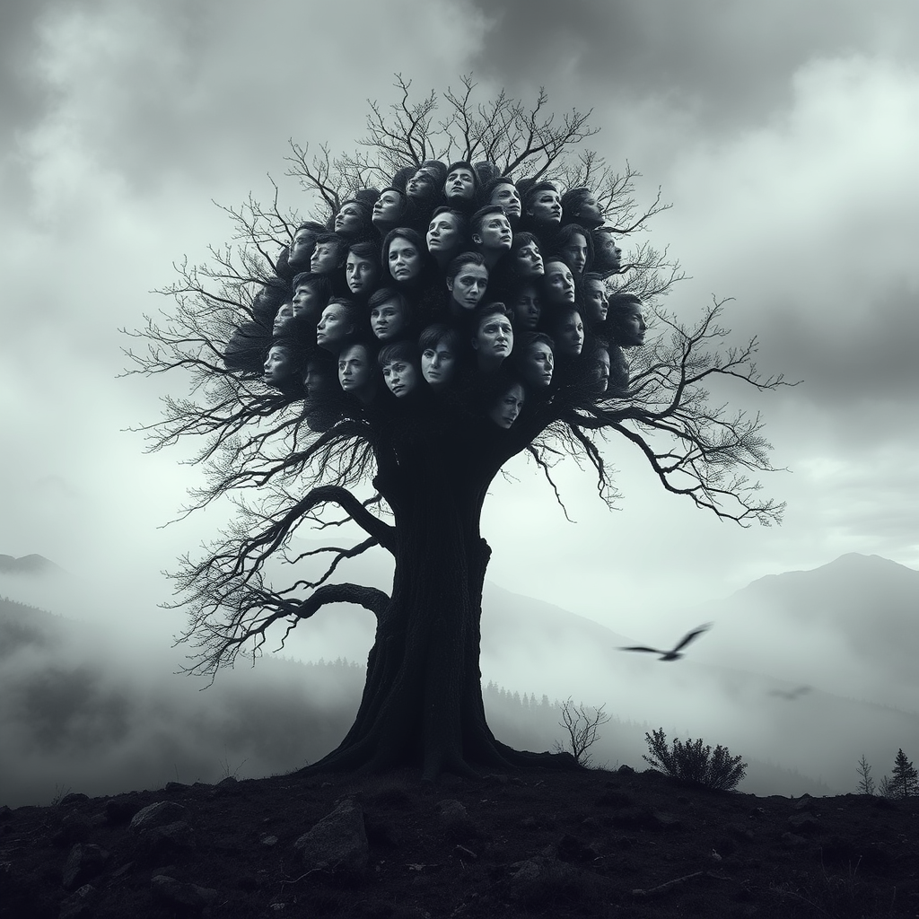 A dark surrealism scene depicting a tree composed of countless human faces, set against a backdrop of a mist-engulfed mountain range, the landscape shrouded in mysterious fog, captured in black and white with hyper-realistic, cinematic photography.