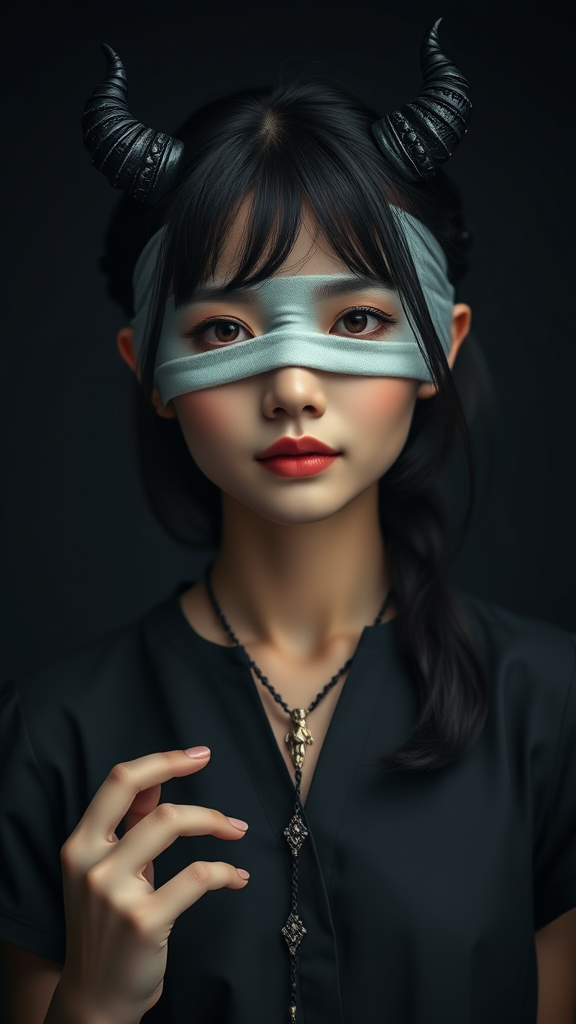 A dark-themed image features a cute woman with demon horns, wearing a blindfold that gently rests across her nose and cheeks. She maintains a serene smile with her closed mouth, embodying an ethereal calmness. Her upper body is adorned with a delicate rosary and a stylish blouse, highlighting her small, graceful features. The composition is captured in stunning UHD, HDR, and 8K quality, showcasing her refined elegance. Her appearance is distinct, with unique eyes and hands that are artistically rendered, adding to her mystical allure. The background complements her presence, creating an immersive and visually captivating scene without distractions or imperfections.