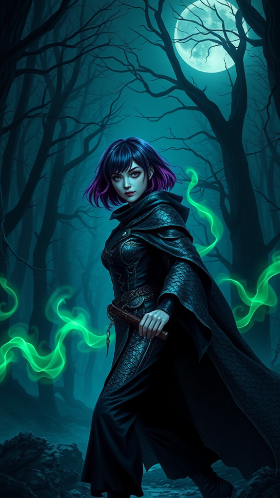 A dark witch adorned in an adventurer's costume, featuring a flowing, majestic cloak shimmering with dragon scales, strides confidently through a mystical fantasy forest. Her short purple-black hair, styled in a trimmed, faded cut, frames her face with enigmatic allure. The scene is set under a dim, enchanting night sky, illuminated by a soft, dark light that casts intricate shadows. Neon green smoke weaves mysteriously through the forest, enhancing the magical ambiance. The digital painting captures this moment with an elegant and detailed focus, evoking the styles of VLOP, Artgerm, Greg Rutkovsky, and Alphonse Mucha. The artwork is a masterpiece of concept art, combining elements of intricate matte painting and clear, refined illustration.