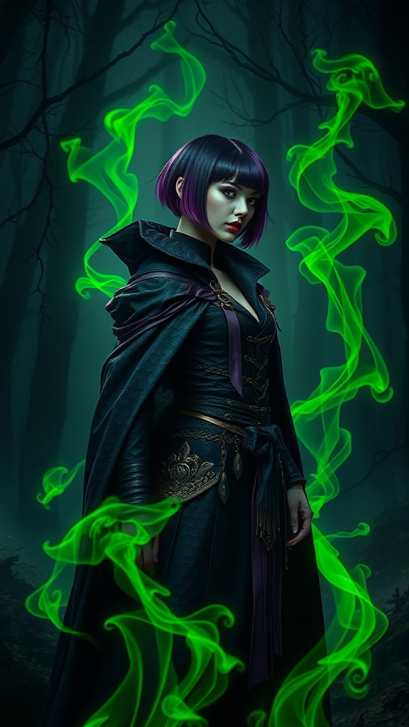 A dark witch clad in a sophisticated adventurer's costume stands amidst a fantasy forest landscape, her imposing big cloak adorned with dragon scales. Her trimmed, short hair is a striking purple-black fade, adding to her mystical aura. The night is enveloped in dark light, creating an intricate and elegant atmosphere. Green neon smoke swirls around her, a testament to her fantasy magic. The scene is captured with a clear focus, showcasing a very detailed digital painting with intricate concept art. The style draws inspiration from the works of VLOP, Artgerm, Greg Rutkowski, and Alphonse Mucha, resulting in a masterpiece that also embraces elements of EasyNegative. This matte painting exudes an ethereal charm, perfectly balancing realism and fantasy.