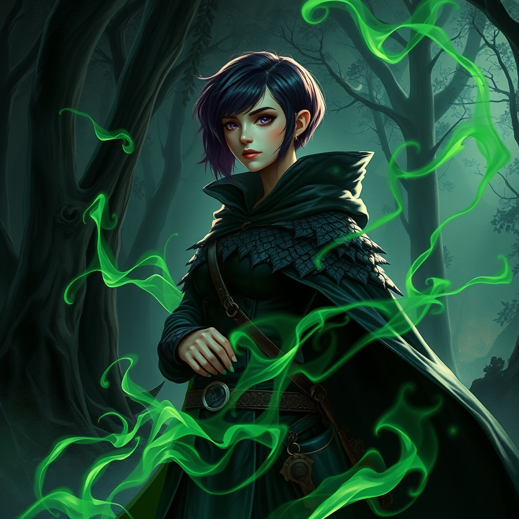 A dark witch in an adventurer costume stands confidently in a fantasy forest landscape, her big cloak billowing around her and adorned with dragon scales. Her trimmed hairstyle features short purple-black faded hair, complementing the dark light of night. The scene is intricate and elegant, rendered with clear focus as a digital painting. Very detailed and illustrative, the artwork captures the magical essence of green neon smoke swirling around her. The style evokes the mastery of artists like VLOP, Artgerm, Greg Rutkowski, and Alphonse Mucha, blending fantasy magic with matte painting techniques. This masterpiece exudes an enchanting allure, balancing the elements of darkness and elegance.