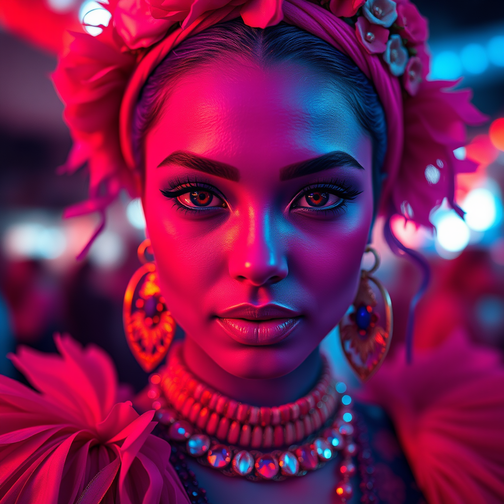 A dazzling blue beauty adorned in a vibrant and colorful ensemble, captured with the artistic style of Brandon Woelfel and Becky Cloonan, showcasing an ultra-high-definition image. The scene is enveloped in hues of light red and red, with luminescent lightscapes reminiscent of Tanya Shatseva's work. A close-up shot taken with a Fujifilm X-T4 and a Sony FE 85mm f/1.4 GM lens, presented in an aspect ratio of 45:56, with vivid details that bring a raw and dynamic energy to the portrait.