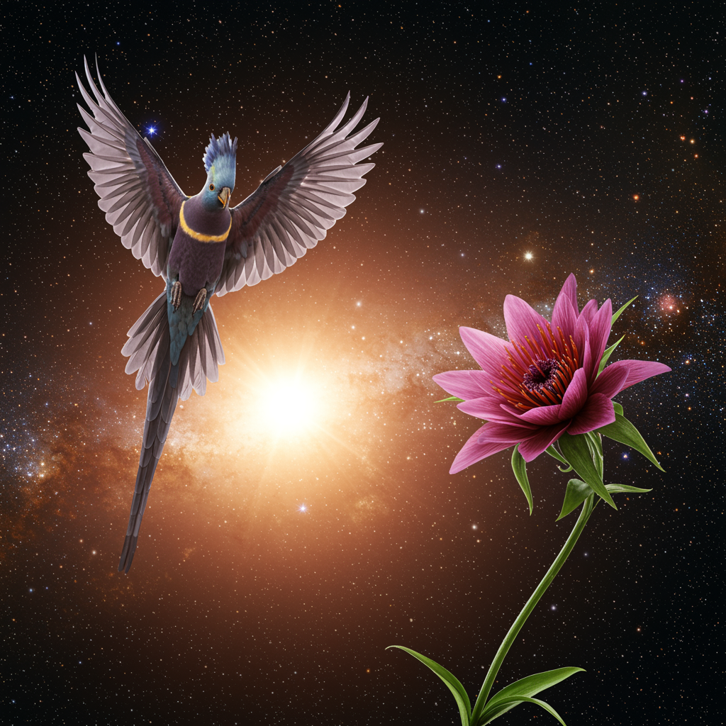 A dazzling colibri gliding through space, its iridescent feathers shimmering like distant stars, alongside a cosmic flower blooming under the radiant glow of a distant sun, surrounded by the vast and boundless beauty of nature captured in stunning 4k detail.