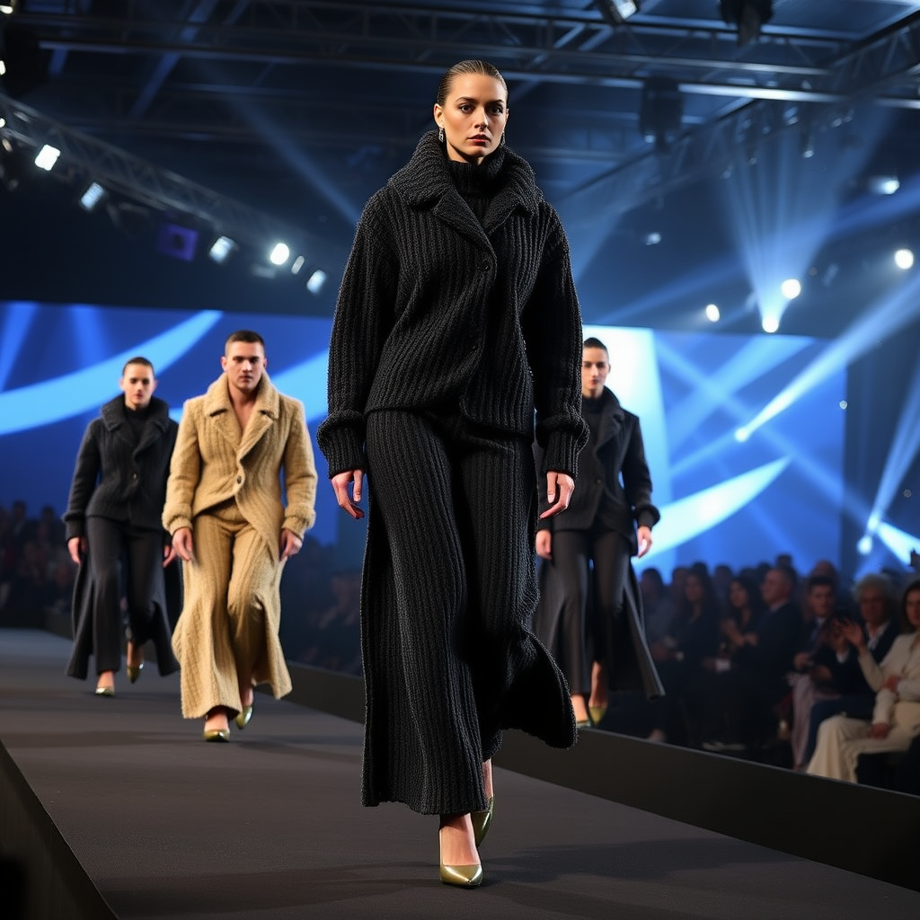 A dazzling display of avant-garde fashion unfolds on the runway, featuring models adorned in extravagant, oversized knitted suits with exaggerated proportions. These Hypersize ensembles, crafted from coarse textiles, command attention as they glide down the catwalk. Elevated by striking high heels, the models reveal the intricacy of each meticulously designed ensemble, where even the tiniest detail is expertly considered. Bright spotlights illuminate the scene, casting a shimmering glow over the breathtaking spectacle of haute couture innovation and exaggerated elegance.