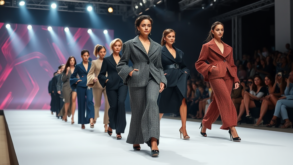 A dazzling fashion show featuring breathtaking haute couture as models strut down the catwalk in voluminous Hypersize suits with exaggerated proportions crafted from richly textured coarse knits. They teeter gracefully on sky-high heels, showcasing the meticulous attention to the tiniest details. Under bright spotlights, each outfit becomes a masterpiece, captivating the audience with its bold expression and avant-garde design.