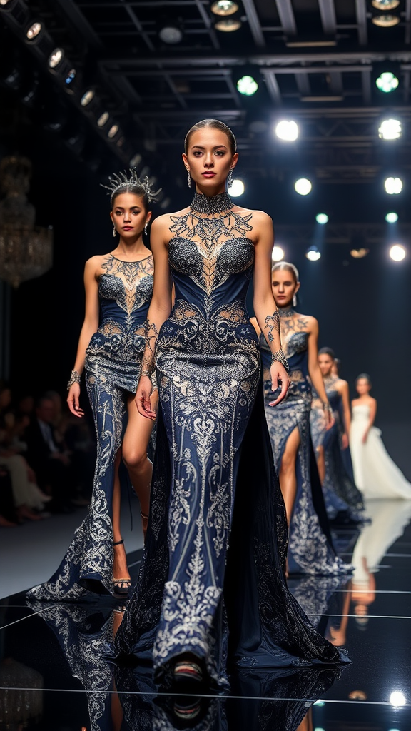 A dazzling fashion show featuring breathtaking haute couture ensembles; each garment meticulously crafted with the finest attention to detail reveals elegance on the catwalk under the bright spotlights, capturing every intricate and striking element as models glide effortlessly along the runway, embodying the pinnacle of fashion artistry and sophistication.