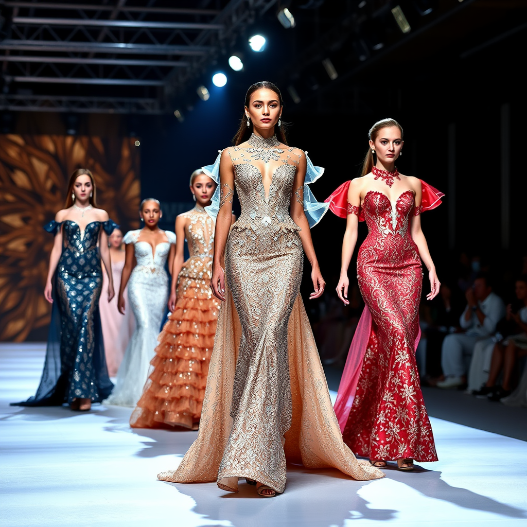 A dazzling fashion show featuring breathtaking haute couture designs, each ensemble showcasing meticulous attention to the minutest details as models glide down the runway. The catwalk sparkles under the bright spotlights, highlighting the artistry and craftsmanship that define each piece, evoking a sense of awe and glamour.