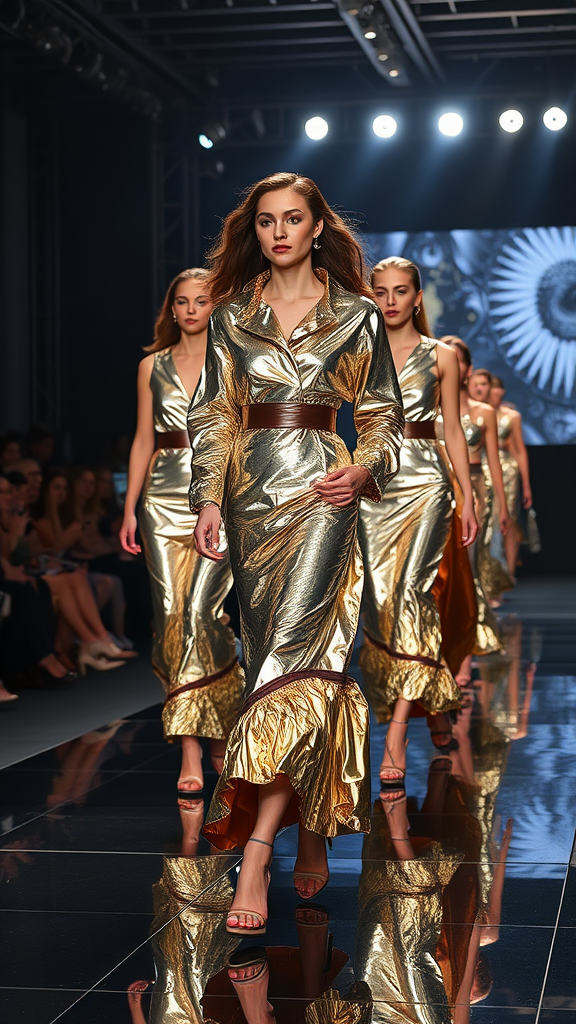 A dazzling fashion show featuring models strutting down the catwalk in extravagant oversized metallic foil ensembles, each piece shimmering under the bright spotlights. These haute couture creations are paired with sky-high heels, enhancing their dramatic silhouettes. Every element is meticulously crafted, from the intricate seams to the subtle texture variations in the material, captivating the audience with their futuristic elegance. The atmosphere is electric, as every step and gaze is a spectacle of artistry and innovation.