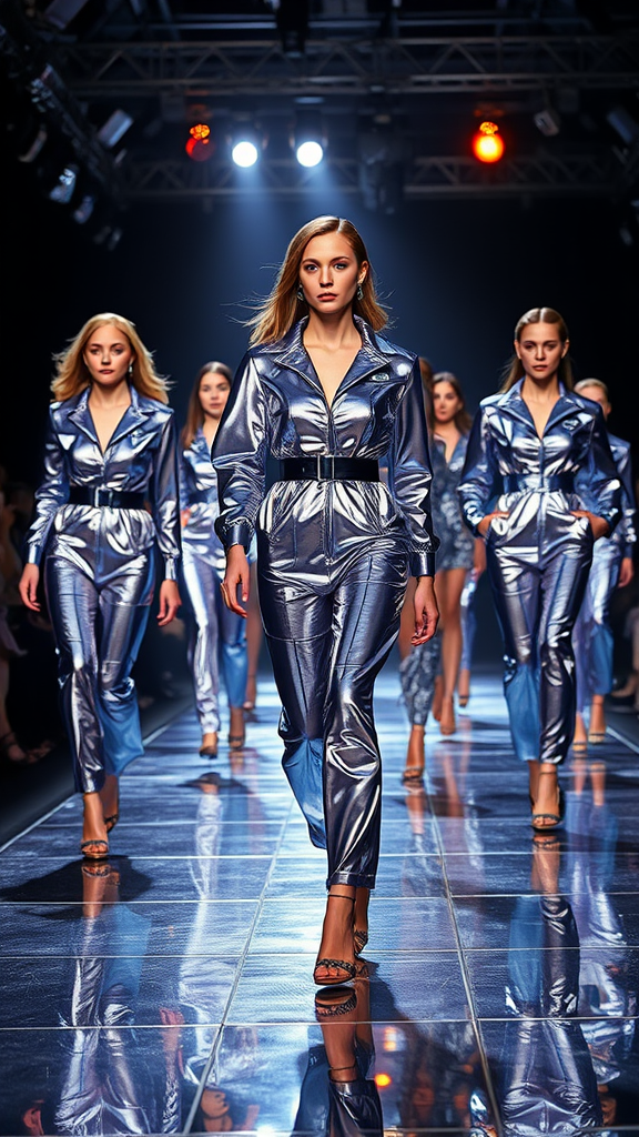 A dazzling fashion show unfolds with models strutting down the catwalk in breathtaking haute couture ensembles, each wearing ultra-puffy metallic foil suits that shimmer under the bright spotlights. Their high heels click rhythmically on the runway, exuding a sense of confidence and elegance. Every intricate detail of the outfits, from the delicate seams to the dramatic silhouettes, captivates the audience. The atmosphere buzzes with excitement as each model's bold and futuristic look tells a story of avant-garde artistry and visionary design.