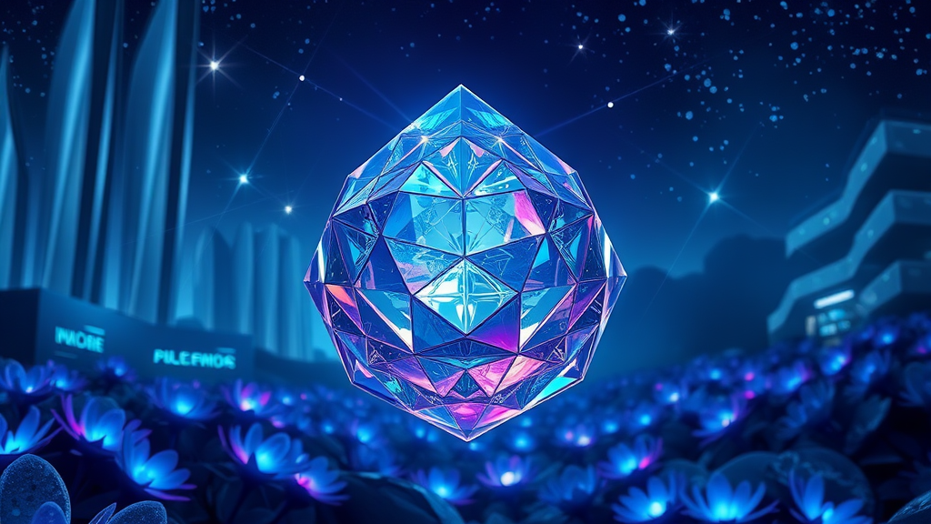 A dazzling, multifaceted crystal set in a futuristic landscape, shimmering with iridescent hues of blue and purple, reflecting the ambient glow of bioluminescent flora. The crystal features intricate geometric patterns etched across its surface, catching beams of light from a distant star. Suspended in the air, it appears almost weightless, emanating subtle, pulsating energies that ripple through the atmosphere, creating a kaleidoscope of colors in its immediate vicinity. The scene is set against a backdrop of sleek, silver skyscrapers and a star-studded sky, enhancing the crystal's otherworldly presence.
