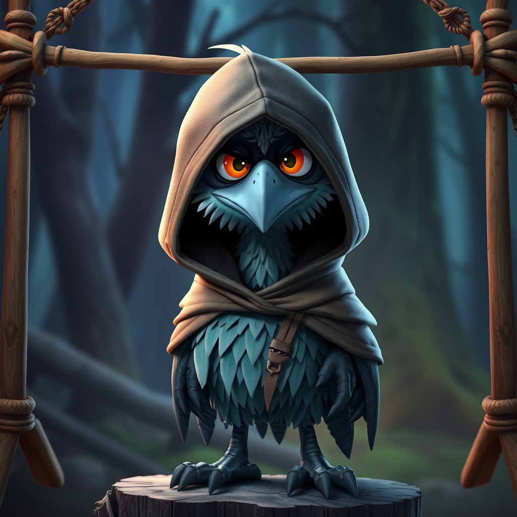 A D&D character featuring a kenku dressed in a hooded cloak standing on a canvas frame, rendered in a 3D cartoon style with photorealistic textures, the bird-like humanoid possesses intricate feather details, their sharp eyes peering curiously from beneath the hood, a background hinting at a mystical forest, with vibrant colors and atmospheric lighting creating a magical and adventurous atmosphere.
