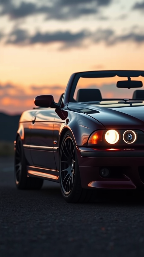 A deep crimson BMW E39 M5 convertible with glowing angel eyes, captured in a breathtaking cinematic style, showcasing hyper-realism and intricate details in stunning 8k resolution, set against a moody twilight backdrop.