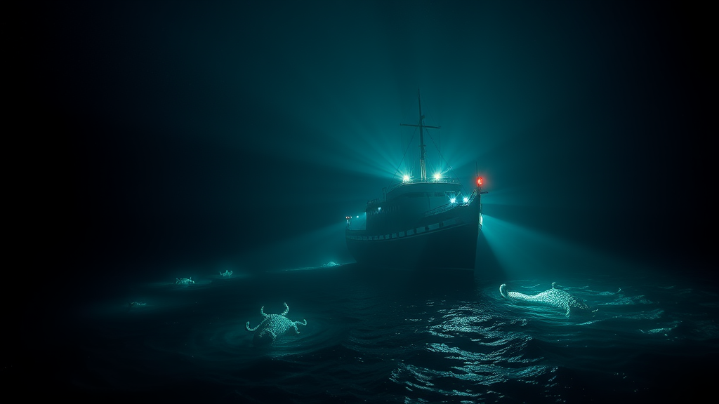 A deep-sea vessel navigates the mysterious depths of the ocean, its lights cutting through the inky darkness, revealing a hidden world of bioluminescent creatures and ancient shipwrecks.