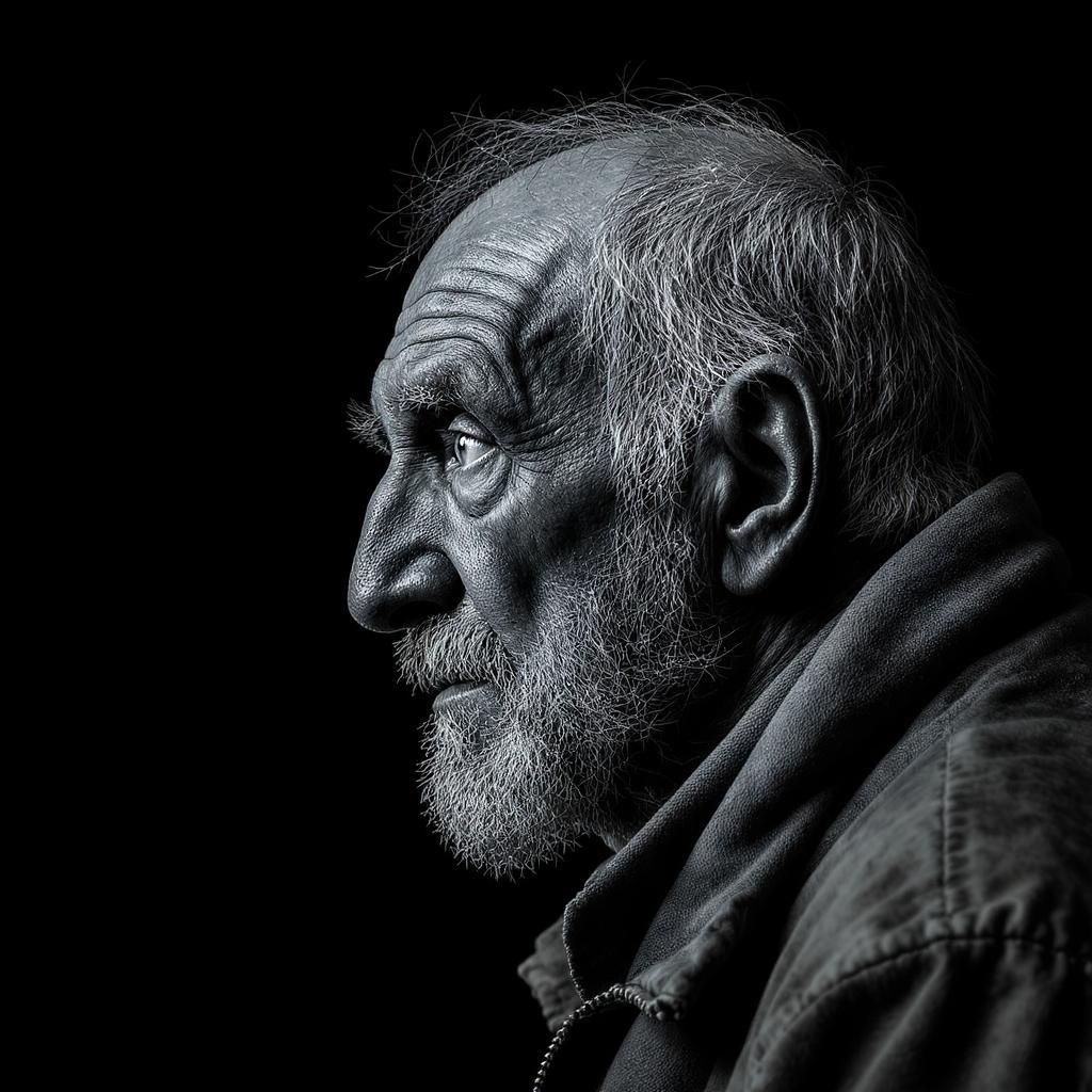 A deeply detailed side profile portrait of an elderly, weary homeless man against a stark black background. Captured in high-definition black and white, every line and wrinkle on his face tells a story of hardship and resilience. His eyes, filled with a blend of wisdom and sorrow, suggest a life marked by deception and madness. His expression, a complex tapestry of emotions, reflects the testing passage of time. The image, reminiscent of a classic Mamiya photograph, evokes a sense of quiet dignity amidst adversity.