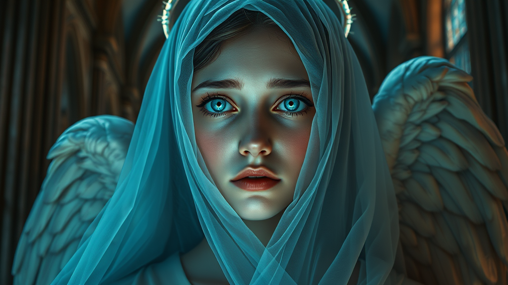 A deeply moving portrait inspired by an epic, realistic depiction of an angel, capturing a profound sadness in her expression. She possesses striking blue eyes and is crowned with a delicate halo of light. The scene is reminiscent of the works of French painter Alexandre Cabanel, featuring a soft veil draping elegantly over her form. The setting is an old cathedral, where the interplay of soft lighting and subtle neon hues creates an ethereal ambiance. Elements of classic painting style blend with touches of 3D and anime influences, resulting in a unique visual narrative. The composition avoids exaggerated features and maintains harmonious anatomy, allowing the viewer to fully engage with the emotional depth of the artwork.