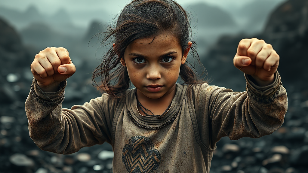 A defiant girl stands in a fierce pose, her clothes dusted with grime and her nose running slightly in the crisp air. Her fists are clenched tightly, and her eyes blaze with determination and resilience, as strands of hair fall loose around her dirt-smudged face. The backdrop is a tumultuous landscape, reflecting her unwavering spirit and indomitable will to fight against all odds.