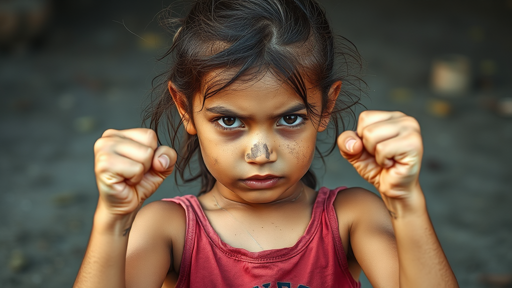 A defiant young girl, standing tall and fierce, her face smeared with dirt, strands of hair wild and untamed. Her fists are clenched tightly, raised in a stance that speaks volumes of her unyielding spirit. A streak of dirt mingles with a runny nose, enhancing her gritty demeanor. Her eyes blaze with determination, a fire that refuses to be extinguished, her posture embodying the essence of rebellion and resilience.