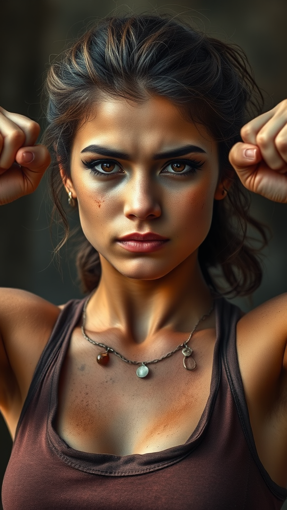 A defiant young woman stands boldly with her fists raised, her posture emanating strength and resilience. Her face is smudged with dirt, evidence of her recent struggles, and her eyes gleam with an unyielding determination. A slight sheen of sweat glistens on her brow, mixing with the grit, while a trickle of sweat runs down her cheek. Her hair, tousled and wild, frames her fierce expression as she braces herself for the challenges ahead, embodying the spirit of rebellion and perseverance.