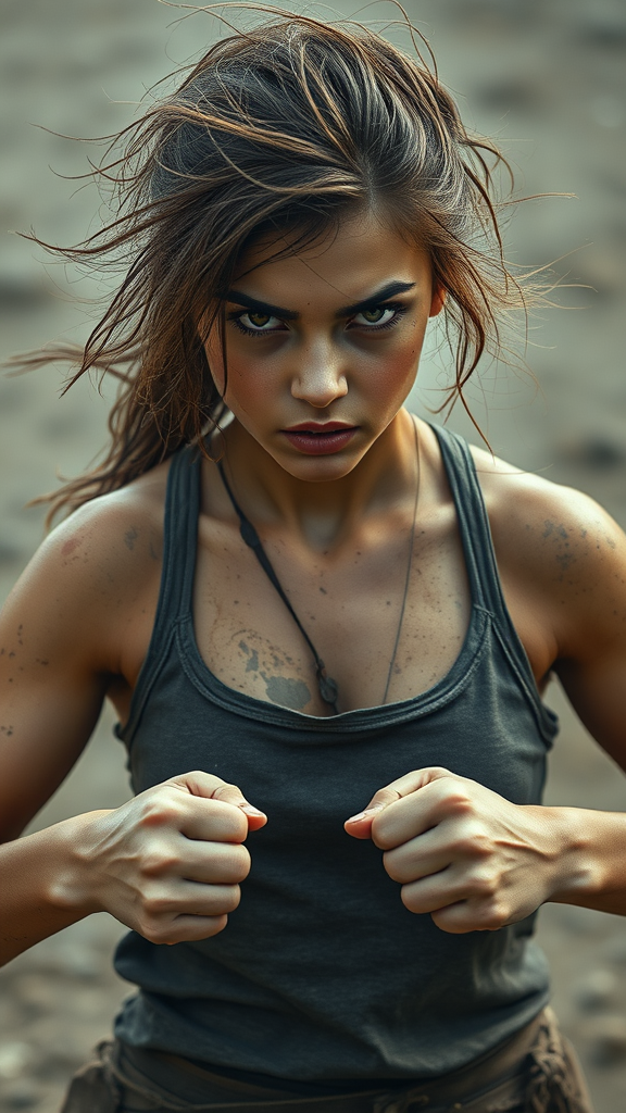 A defiant young woman stands poised for battle, her hair tousled and flecked with dust, a fierce glint in her eyes. Her skin is streaked with dirt and sweat, and a trail from her nose hints at the hardships she's faced. Her fists are clenched and ready, her stance radiating unyielding determination and resilience against all odds.