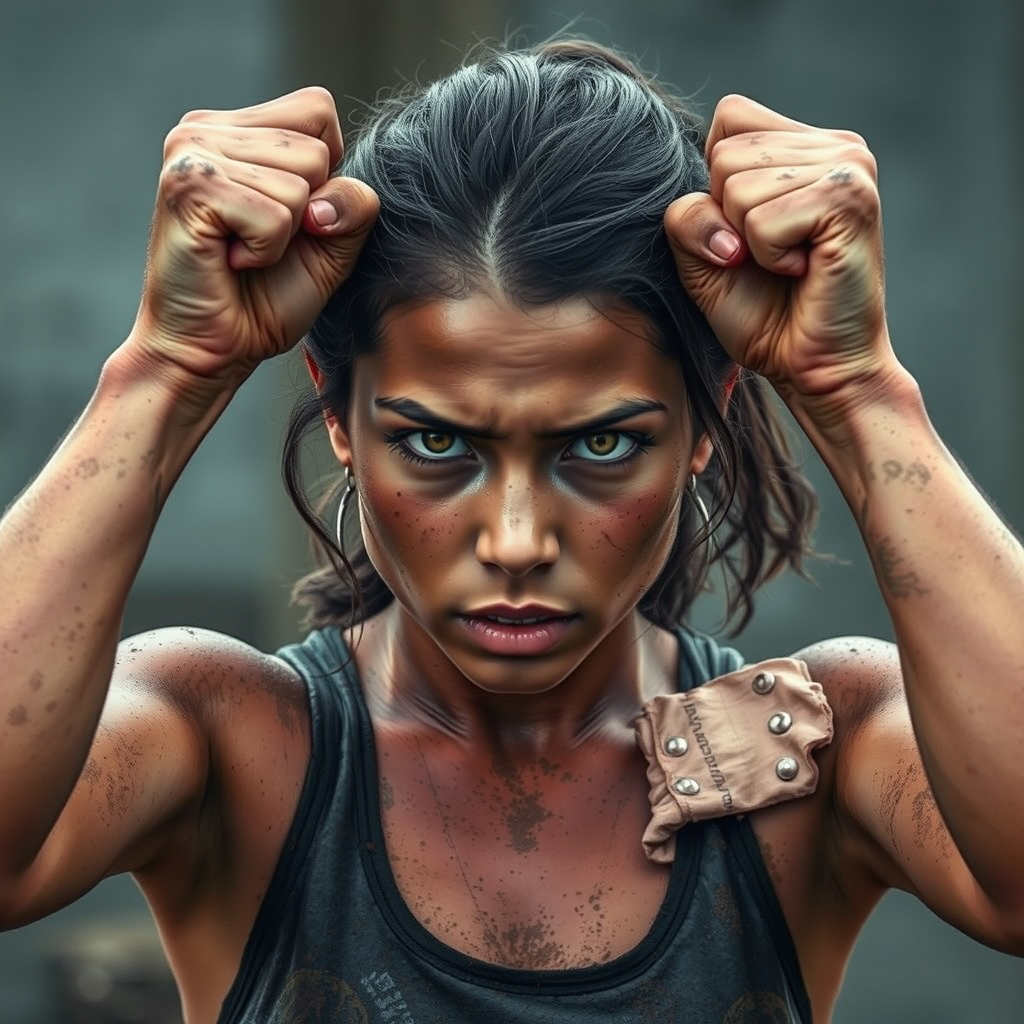 A defiant young woman stands poised in a combative stance, her skin smudged with dirt, her expression hardened with determination, and her fists raised. Tears and grime mingle on her cheeks as her nose runs slightly, yet her resolute gaze suggests an unyielding spirit and readiness for the struggle ahead. The scene is imbued with the raw energy of a fighter unafraid to face her challenges head-on, embodying resilience and grit.