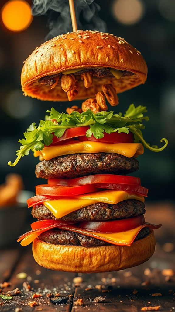 A delectable burger disassembling in mid-air, each layer succulent, flavorful, and steaming; a promotional shot capturing intricate textures and vibrant colors in high-definition, with a cinematic flair, expertly enhanced through Adobe Lightroom to bring out exceptional detail and mouth-watering appeal.