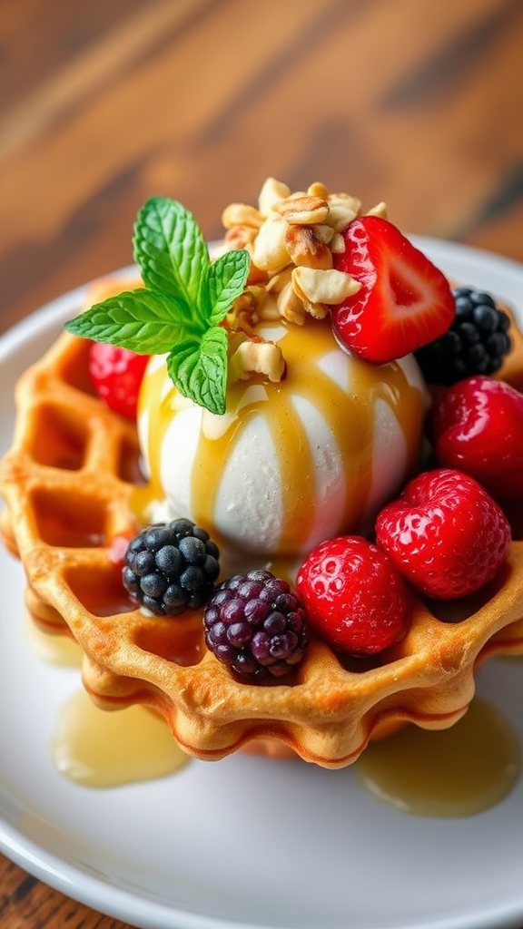 A delectable scoop of creamy gelato nestled in a golden, crispy half-sphere waffle bowl, adorned with a medley of fresh berries and drizzled with a honey glaze, topped off with a sprinkle of chopped nuts and a hint of aromatic mint leaves.