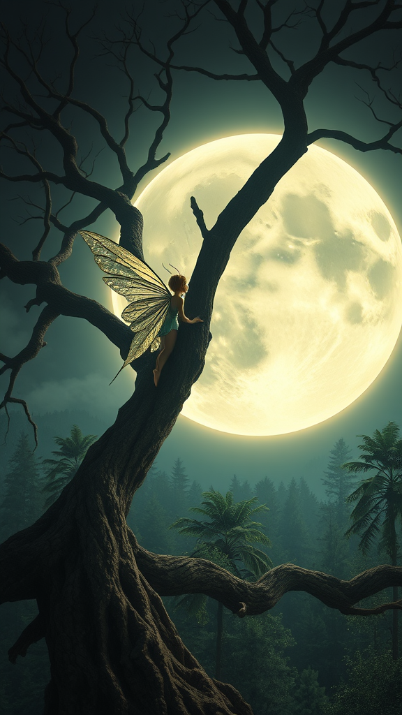A delicate fairy with shimmering wings perched on an ancient tree, gazing at the luminous moon, surrounded by a mystical forest. The scene resembles satellite imagery, capturing the epic fantasy vibe with studio quality lighting. Moonlight bathes the surroundings, revealing an enormous glowing moon that dominates the sky. The atmosphere is rich with realism, showcasing an abundance of intricate details, enhanced further by an 8k resolution, capturing every nuance of this enchanting night under an expansive celestial backdrop.