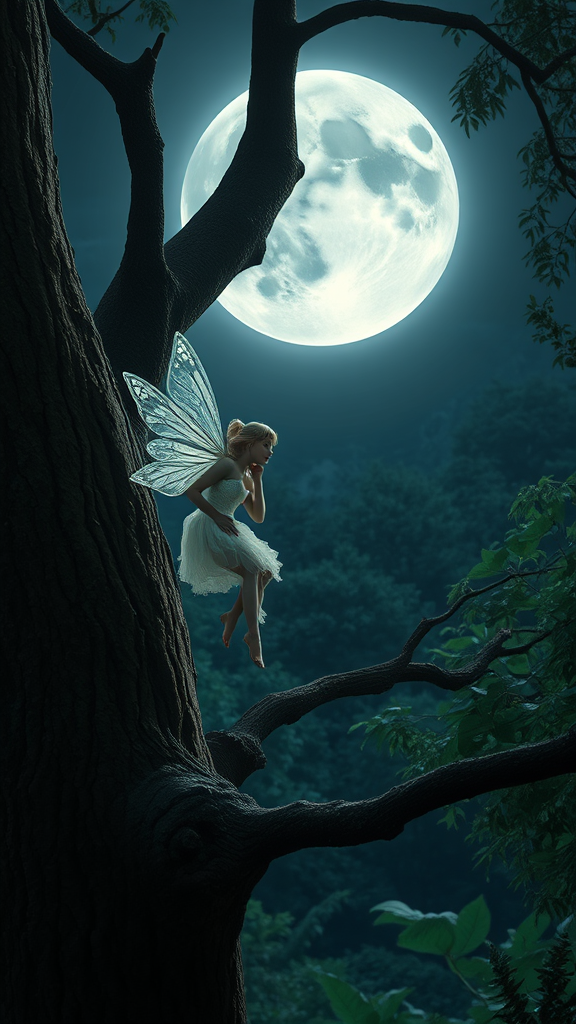 A delicate fairy with shimmering wings perched on an ancient tree, her gaze fixed on the luminescent moon hanging high in the night sky. The surrounding forest is bathed in an ethereal glow, reminiscent of an enchanting epic fantasy. The scene captures a studio photograph's clarity, where the soft moonlight illuminates the fairy’s serene expression and intricate wings. In the backdrop, a colossal moon cast its silvery light over the lush foliage, accentuating the atmosphere with a realistic touch filled with intricate detail. High-quality imagery reveals countless nuances in the fairy's attire and the tree's bark, presented in breathtaking 8k resolution, immersing the viewer in the tranquil and magical nightscape.