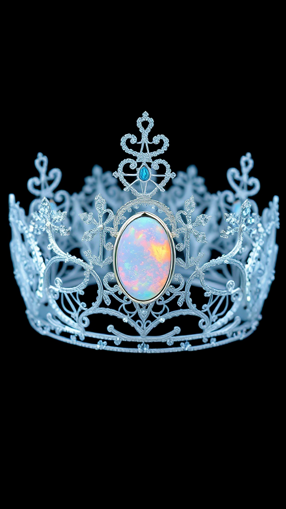 A delicate filigree princess crown made from iridescent glass and mother of pearl, crafted in the whimsical style of Disney's Frozen and designed by the visionary Philippe Starck, features a intricately curved silhouette with snowflake motifs and frost-kissed accents. Scores of tiny, shimmering crystals are carefully inlaid within the crown's framework, suspended in delicate glasswork like a thousand tiny icicles, each one a mesmerizing blend of crystal and color. The crown's centerpiece is a stunning, glittering opal cabochon that glows like the first light of dawn on a winter's morning. This enchanting, frosty regalia is fit for a royal princess, with its coolest, most ethereal beauty. The 18k gold setting helps to amplify the opal's mystical sheen and the delicate craftsmanship showcases Starck's iconic minimalist-meets-high-glamour style.