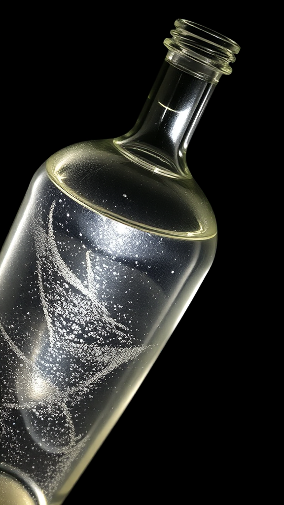 A delicate glass bottle with shimmering liquid inside, set against a deep black background, capturing the play of light and shadow, highlighting the bottle's curves and reflections, emphasizing a minimalist yet dramatic composition, with a touch of mystery and elegance, evoking a sense of curiosity and intrigue, maintaining a raw and unrefined aesthetic.