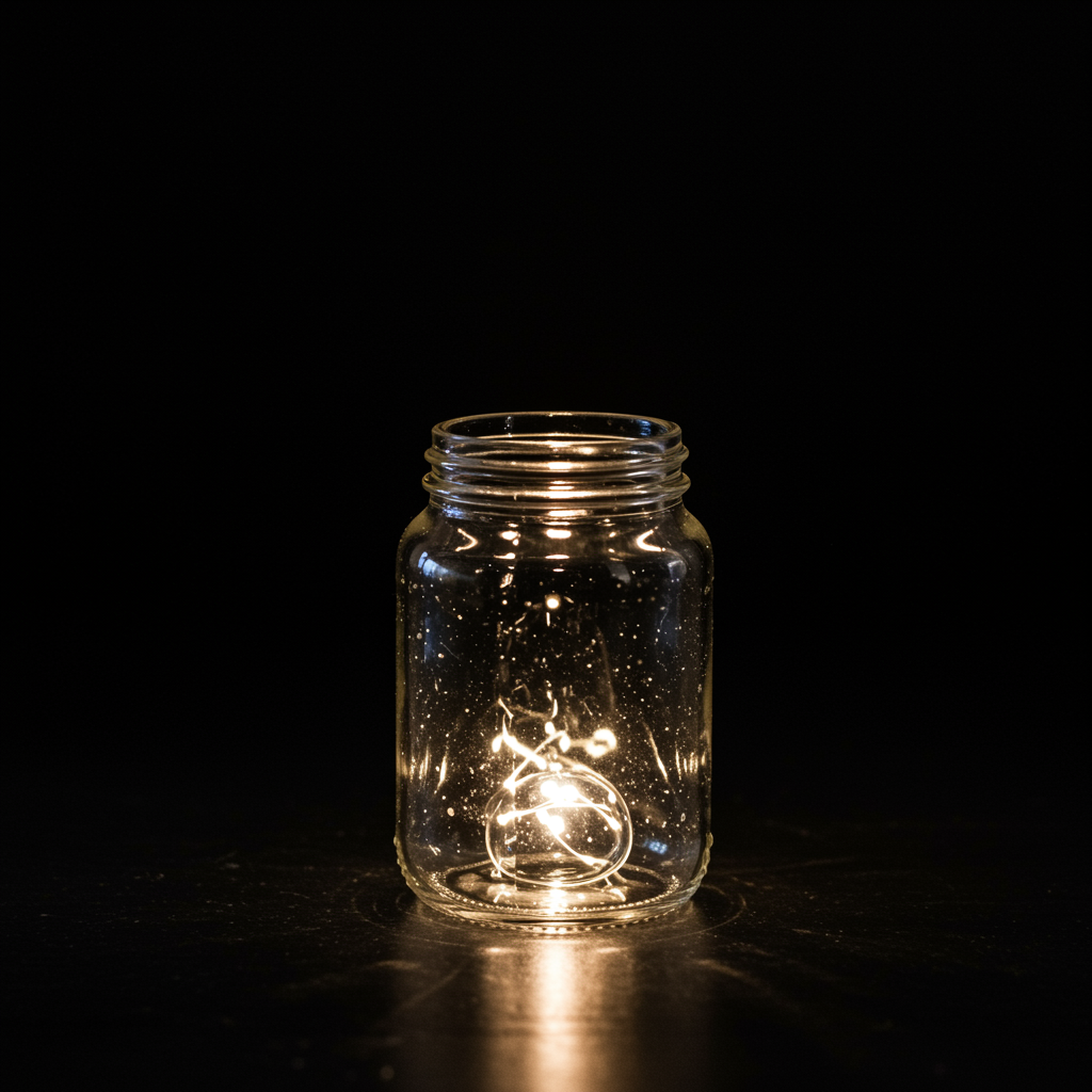A delicate glass jar, illuminated softly from within, rests against a stark, dark backdrop. The subtle glow casts intricate patterns as it escapes, creating a captivating play of light and shadow. Hints of shimmering reflections dance across the surface, drawing the eye to the mysteries held in its depths. The composition is elongated and graceful, enhancing the allure of the scene, with raw textures adding an authentic, untamed edge.