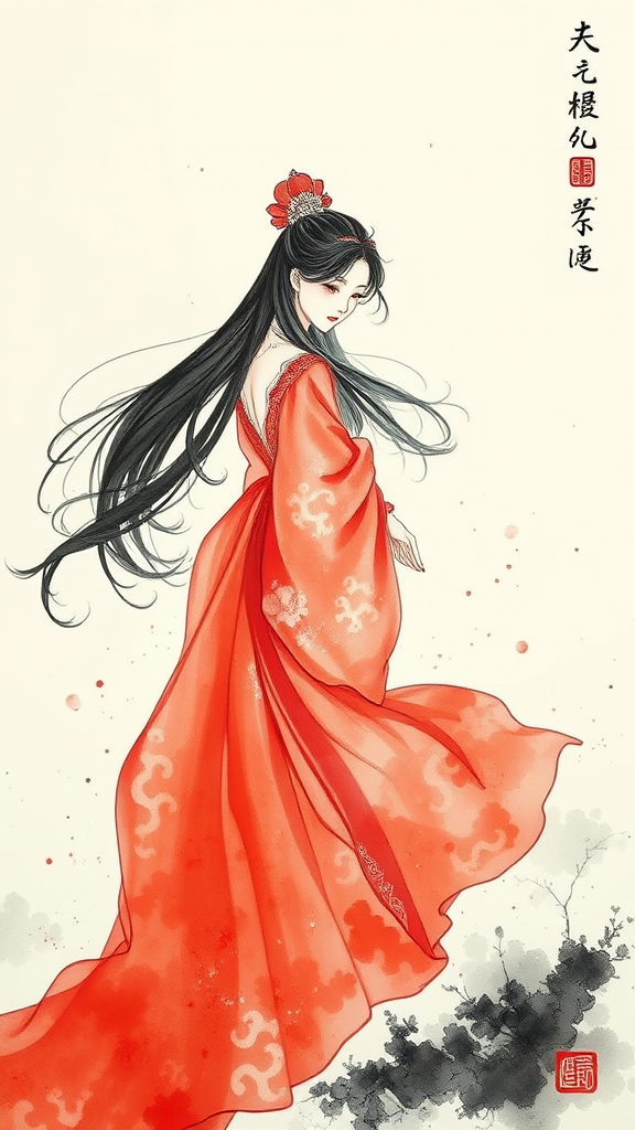 A delicate ink wash painting depicting a woman in a flowing red gown, her long black hair cascading gracefully, set against a pure white background. She stands amidst an epic fantasy landscape, evoking the timeless elegance of traditional Chinese art. Her attire is intricately detailed, reflecting ancient customs, while soft focus blurs her surroundings into a dreamy haze. Gentle splatters and drips of ink accentuate the scene, adding a sense of movement and spontaneity. The composition captures the essence of enchantment and mystery, with a subtle, artistic flair.