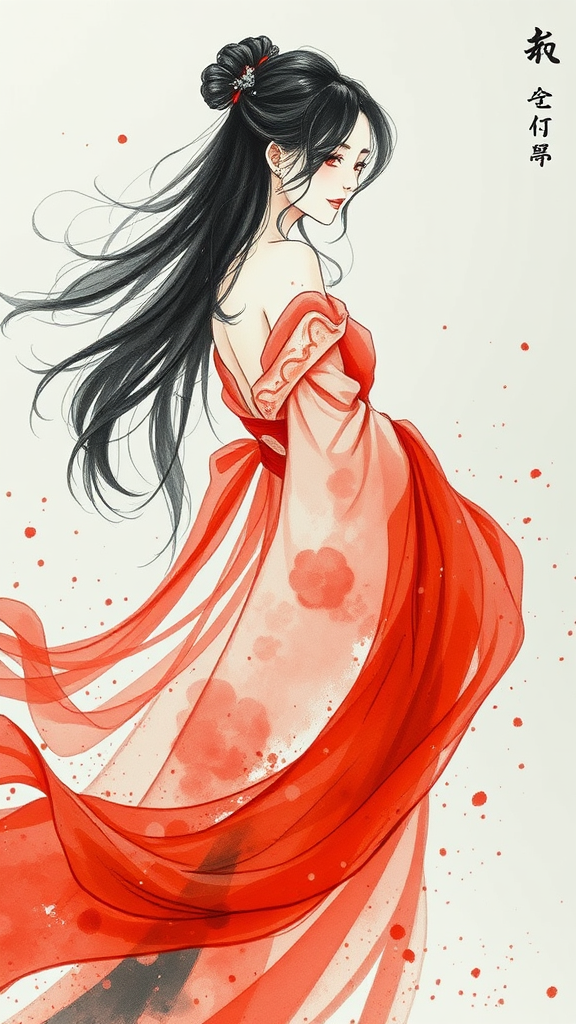 A delicate ink wash painting depicting a woman in a flowing red gown, her long black hair cascading gracefully. The scene blends elements of epic fantasy and traditional Chinese art, with splatters and drips giving a dynamic energy against the white background. She is adorned in traditional costumes, her form softly blurred as if viewed through a gentle mist. The atmosphere evokes a sense of timeless elegance and mystical beauty, capturing a moment suspended between reality and fantasy.