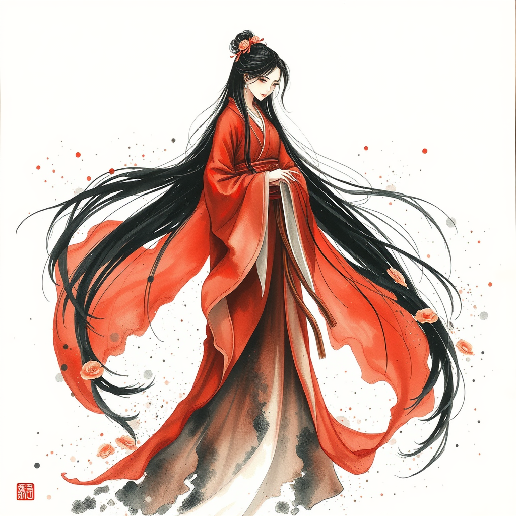 A delicate ink wash painting of a woman in a flowing red robe, her long black hair cascading like a waterfall, surrounded by an epic fantasy landscape. The scene is inspired by traditional Chinese painting techniques, with splattered and dripped ink details adding texture. She stands poised against a soft, white background, evoking a sense of ethereal beauty. Her traditional costume is rich in detail but softened by a gentle, soft-focus lens effect, blending elegance and mystique in a harmonious dance of colors and light.