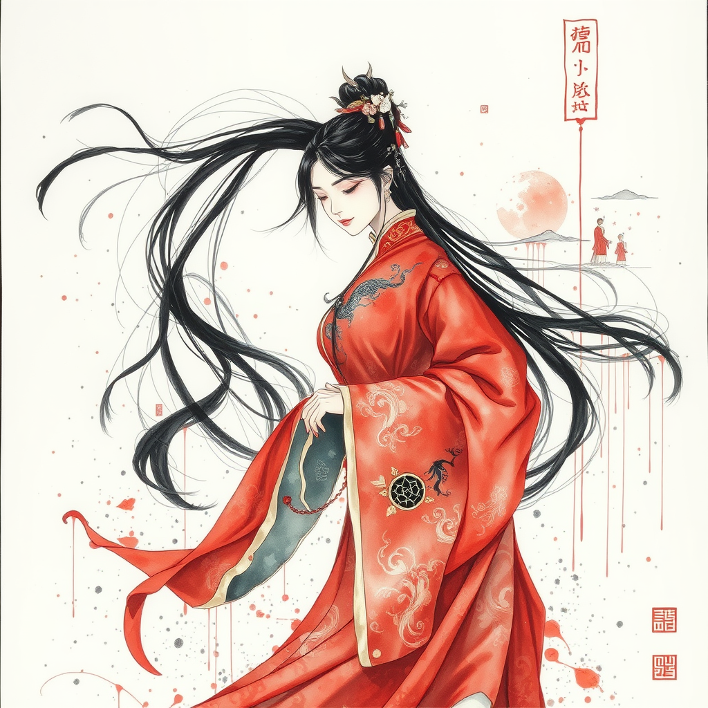 A delicate ink wash painting of a woman in an elaborate red traditional costume, her long black hair flowing gracefully. She stands amidst an epic fantasy scene, where ethereal landscapes blend seamlessly with splattered and dripped ink effects against a white background. The focus is soft, evoking a dreamlike ambiance reminiscent of classic Chinese paintings. The scene is subtly embellished with mystical creatures and ancient symbols woven into the intricate details of her gown, adding layers of fantasy and intrigue.