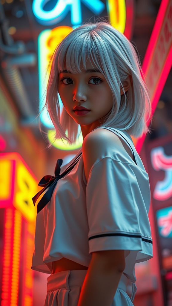 A delicate Japanese schoolgirl with olive-toned skin and effortless, medium-length white hair, which falls gently down her back. Her eyes, an exquisite combination of warm earthy tones and bright, sparkling undertones, are the centerpiece of her beauty. Her petite frame is toned and athletic, yet still retains a youthful, innocent charm. Her small yet pert breasts are softly constrained by a crisp, white schoolgirl uniform that accentuates her midriff, creating a delicate silhouette. This breathtaking image is set against an enchanting backdrop of vibrant, swirling neon lights, as if the colors themselves were born of smoke, adding an air of mystery and enchantment. Hyperrealistic in its level of detail, the scene is illuminated with cinematic lighting that accentuates every curve and plane of her body, creating a sense of depth and dimensionality. Shot in 8K UHD at an aspect ratio of 2.39:1, this is an ultra-high-fidelity visual masterpiece.