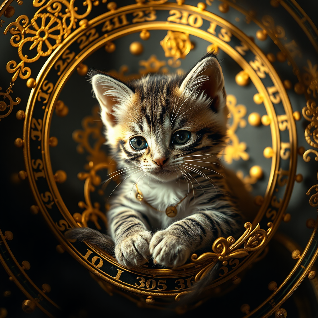 A delicate kitten adorned with intricate gold clockwork patterns, nestled within an elaborate web of golden filigree against a shadowy, abstract backdrop; the scene embodies chiaroscuro, capturing every finely detailed feature with photorealistic and hyper-realistic precision. The composition suggests motion and acceleration, rendered in stunning 8K and HD super resolution, evoking a cinematic essence with long exposure techniques; framed in a perfectly balanced 1:1 aspect ratio.