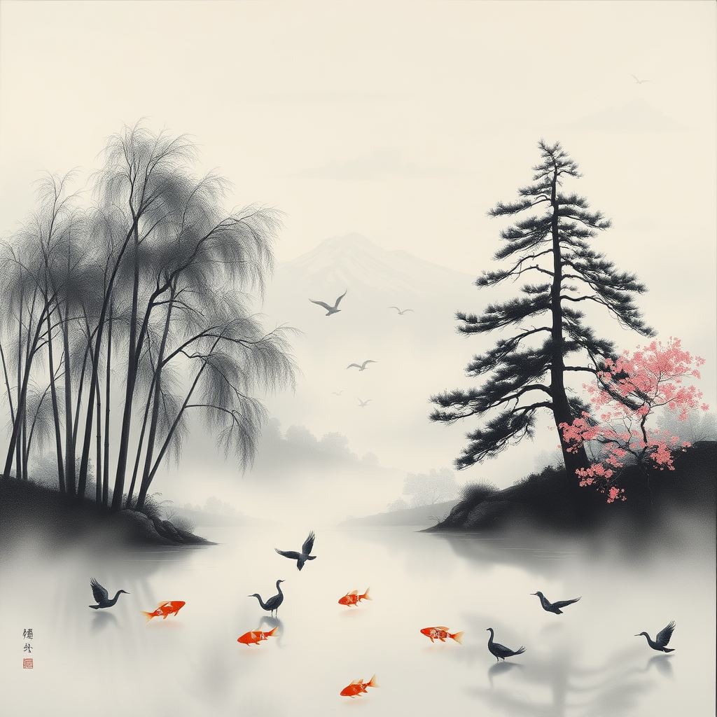 A delicate suibokuga painting captures a misty landscape with towering bamboo and ancient pine trees, their delicate branches reaching into a misty sky. Soft, swirling clouds blend seamlessly with the mountains in the distance, creating a sense of peaceful transcendence. The serenity of a koi-filled pond mirrors the sky, surrounded by shadowy silhouettes of cranes and cherry blossoms, bringing a harmonious connection between earth and sky within an elongated, ethereal composition.