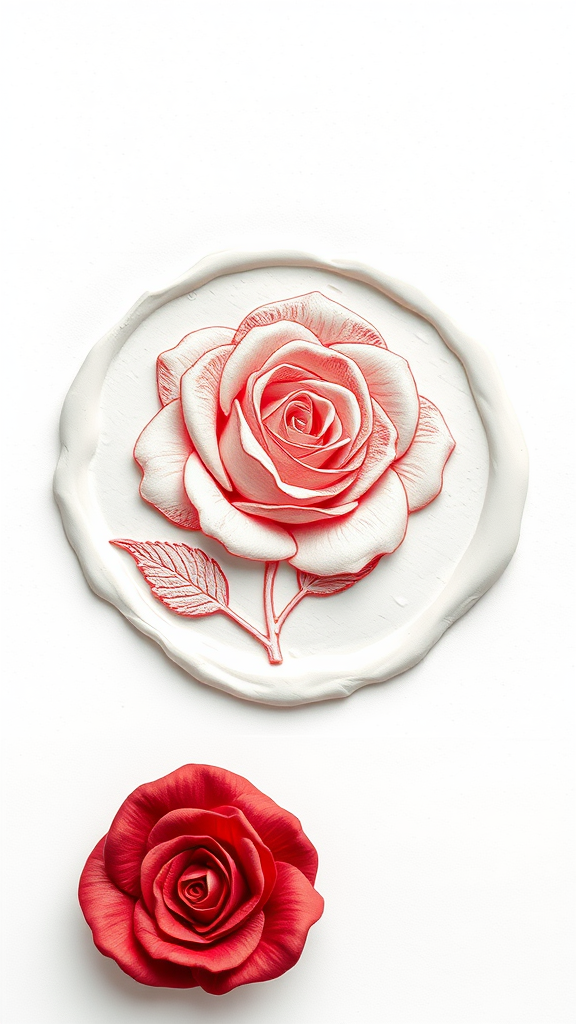 A delicate wax seal featuring an intricately detailed rose, set against a pristine white background. The design is reminiscent of the surreal detail of Brian Mashburn, infused with the romantic elegance of Jean-André Rixens, and the bold, graphic style of Marjane Satrapi. The composition evokes a sense of emotional complexity, viewed from an aerial perspective. The piece vibrates with the subtle opulence of a bygone era, yet remains contemporary, reflecting a period aesthetic from 1970 to the present. The artwork's allure is intensified by a unique and slightly stylized touch.