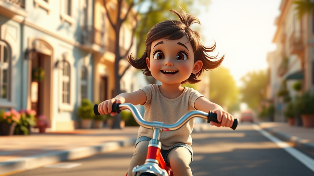 A delightful 6-year-old girl joyfully riding a tricycle down a picturesque street on a sunny day, rendered in stunning 3D art using C4D and Octane, with ray tracing and clay material textures. Inspired by Popmart blind boxes and Pixar's animation style, the scene features dynamic lighting, depth of field, and ultra-detailed elements to highlight the whimsical atmosphere. Aspect ratio 9:16, high quality, scene smoothly captures the vibrant spirit of childhood adventure.