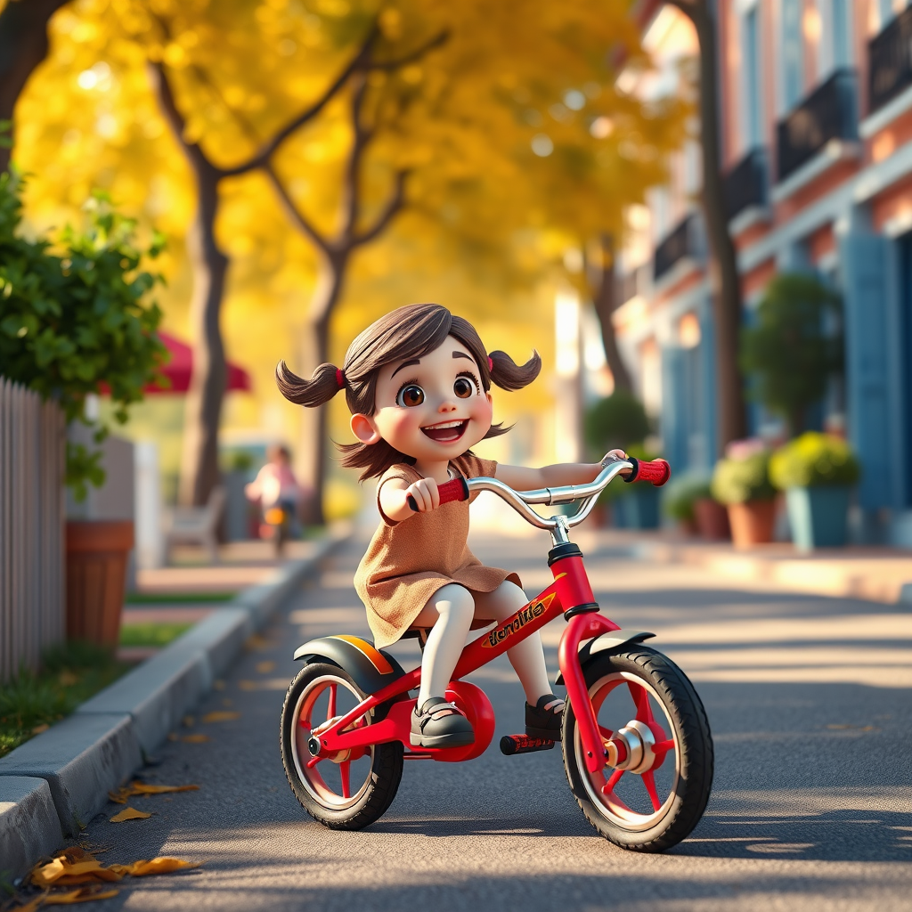 A delightful 6-year-old girl joyfully riding her tricycle along a picturesque street on a sunny day, captured in stunning 3D art using Cinema 4D and rendered with Octane, featuring ray tracing and clay material textures. Inspired by Popmart blind boxes and the Pixar animation style, the scene showcases vibrant animation lighting, intricate details, and a pronounced depth of field. The artwork is ultra-detailed, bringing the charming moment to life within an aspect ratio of 9:16, evoking an enchanting, whimsical atmosphere.