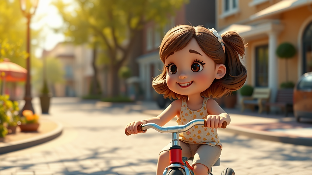A delightful and charming 6-year-old girl rides her tricycle down a picturesque street on a sunny day, captured with intricate 3D art style using Cinema 4D and Octane Render with realistic ray tracing. The scene has a clay-like texture reminiscent of a Pop-Mart blind box, embodying the playful whimsy of Pixar's animation style. The lighting is dynamic and vibrant, adding depth and warmth, while the focus on ultra-detailed features and a soft depth of field brings the scene to life in a captivating 9:16 ratio.