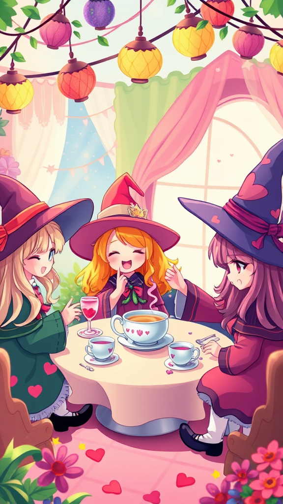 A delightful and vivid scene unfolds where charming chibi witches gather for a joyful tea party. Bright colors dance across the setting, creating a lively and heartwarming atmosphere filled with laughter and whimsical magic all around.