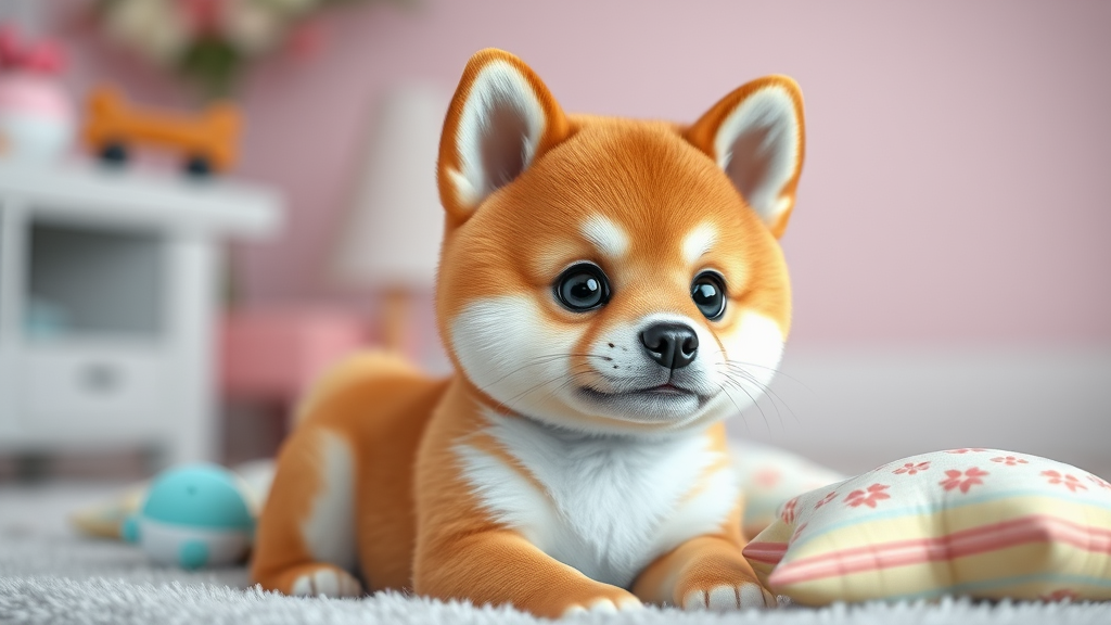 A delightful baby Shiba Inu puppy portrayed in a 3D octane render styled after Fortnite, featuring elaborate details and studio lighting. The scene unfolds with soft pastel colors, highlighting the puppy's adorably fluffy fur. Its big, expressive eyes gleam with charm. The composition includes playful props like a tiny toy bone and a miniature cushion. Every aspect is rendered in ultra-realistic detail, capturing the essence of cuteness in this vibrant and dynamic setting.