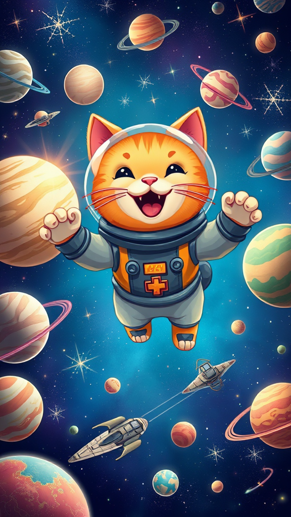 A delightful cat with a cheerful smile is dressed in a vibrantly colored space suit, playfully floating amidst the infinite expanse of space. Surrounding this whimsical scene are an array of exotic planets, each painted with vivid colors and intricate, cartoon-like details that catch the eye. Bright stars twinkle in the background, adding a touch of magic to the cosmic landscape. Scattered around are sleek spaceships zipping by and glowing comets streaking across the scene, contributing to the lively and futuristic atmosphere of this enchanting interstellar adventure.